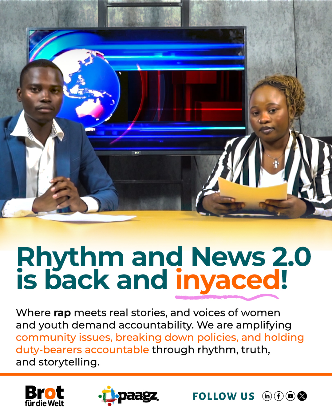 Rhythm and News 2.0! A creative civic engagement platform that blends rap, journalism, and community dialogue to amplify the voices of marginalized women and youth in Zambia. Implemented by PAAGZ, with support from Brot für die Welt (BfTW) the program...